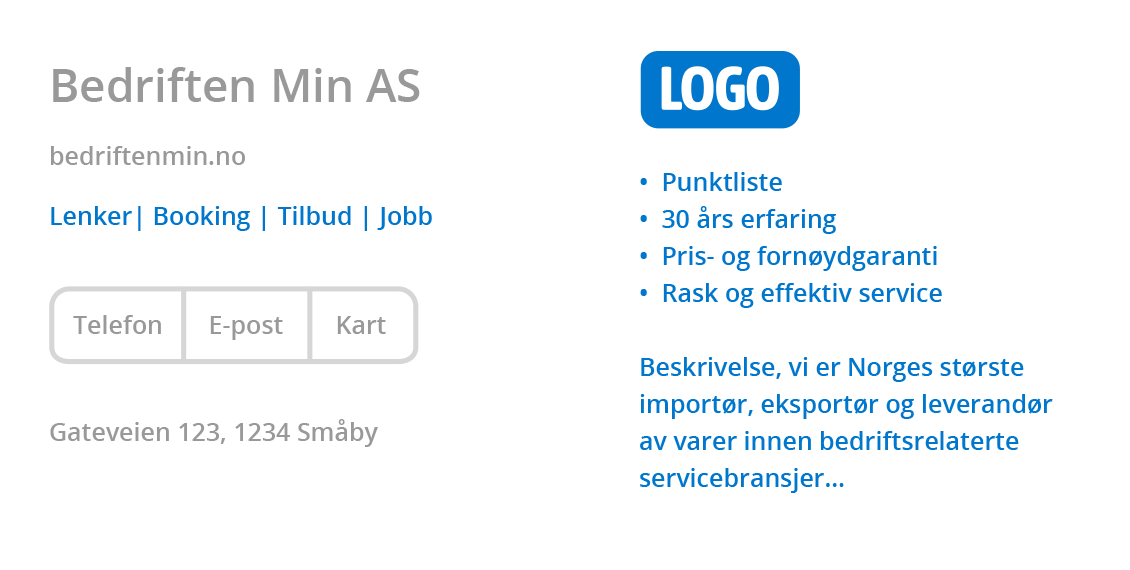 Legg til fire ekstra lenker til din bedrifts viktigste nettsider for eksempel tjenester, ledige stillinger, kampanjer etc. Pris kr 1.500,- pr år.