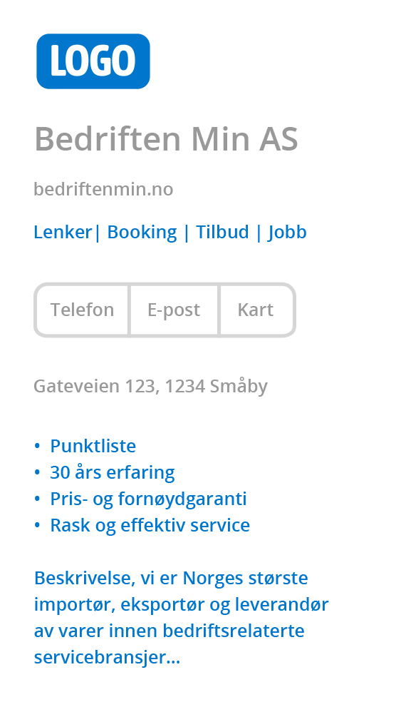 Se også våre annonsepakker for synlighet i søkeresultatet og utvidet informasjon